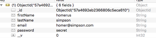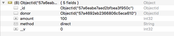 Restart the app now and make a donation. Examine the donation object in Robomongo:
