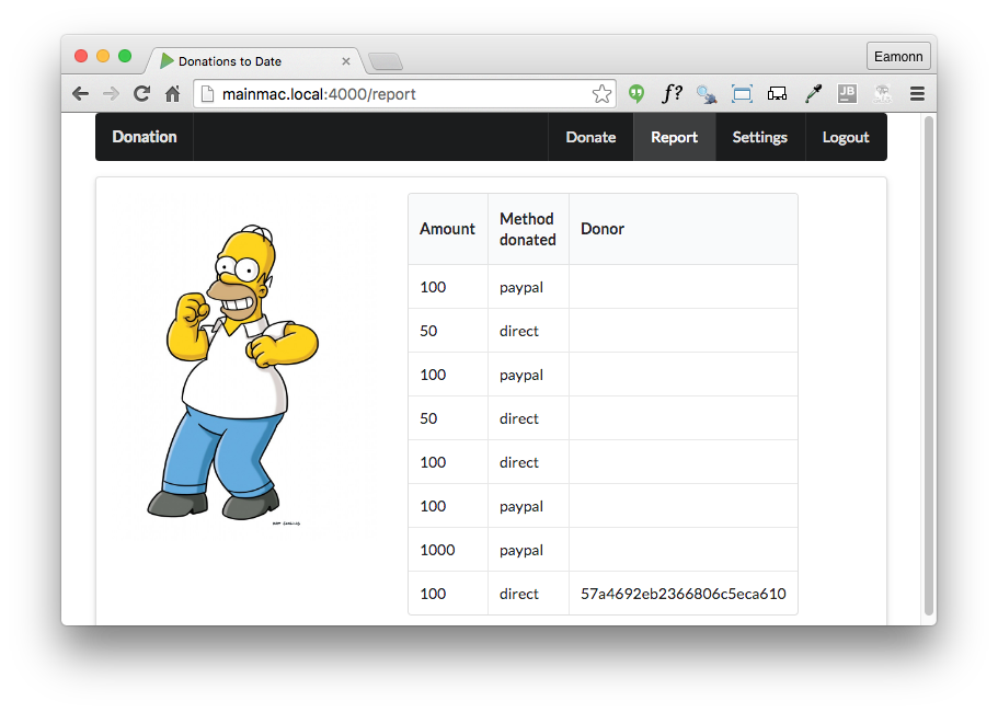 You may notice that it does not work on the first attempt - as your Mongo database may have older version of the donation object in the donations collection. These older reference do not have the donor id as a field, and hence the above query will throw an exception. Delete all your donations objects completed, and the app should run correctly.