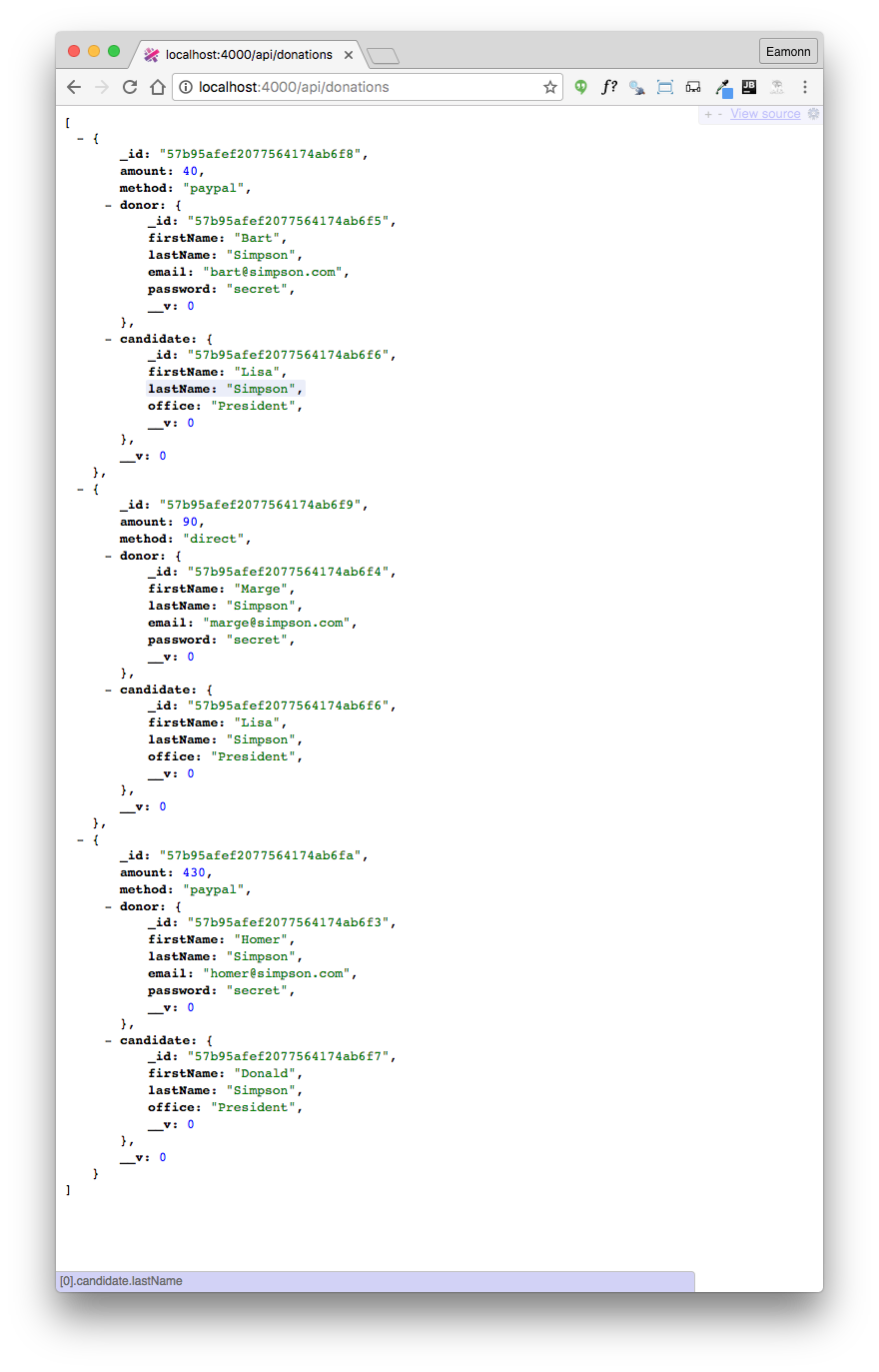 Donations are associated with candidates and donors. Using REST principles we imagine a simple path that could yield donations for a specific candidate: