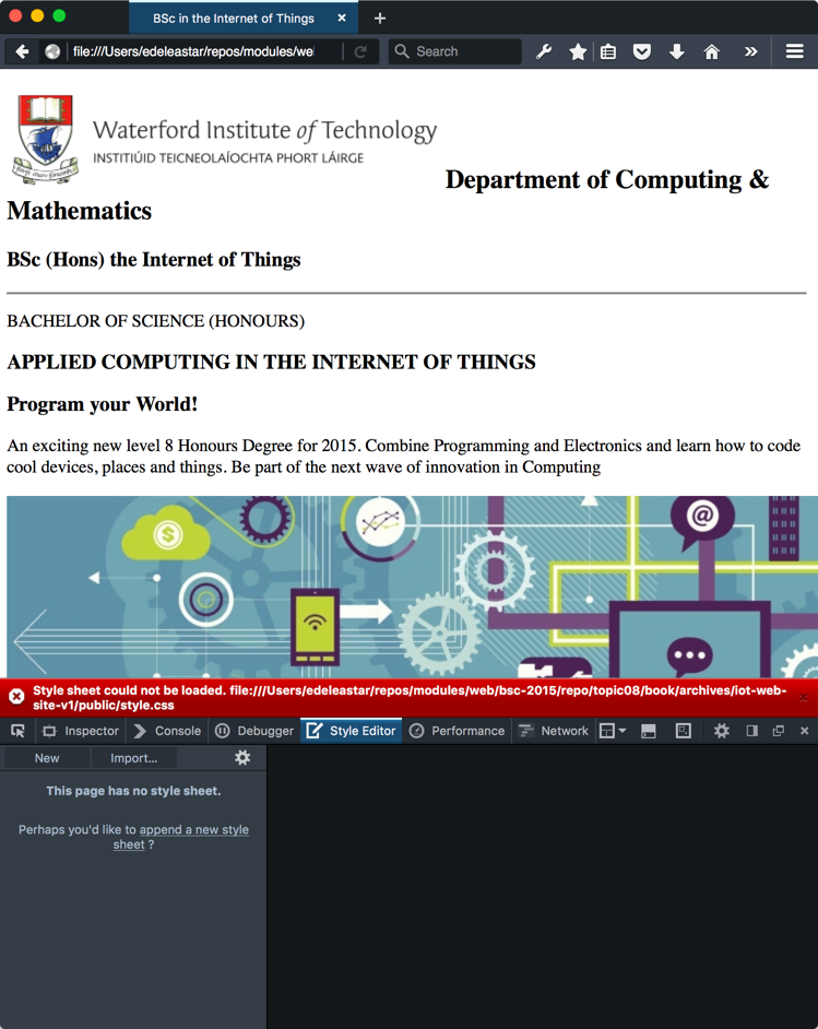 Note that it is currently showing an error for our site - we are linking to style.css in the head, but we haven't provided a css file yet.