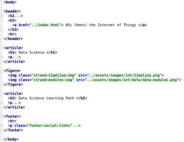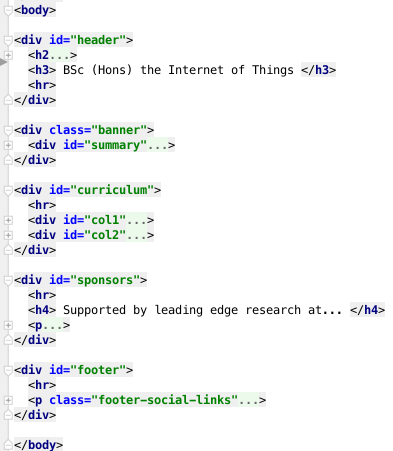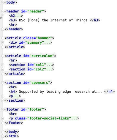 The completed site has a reasonable user experience, but the Developer Experience leaves something to be desired. In particular, we are overusing <div> elements, when suitable Semantic Elements are available: