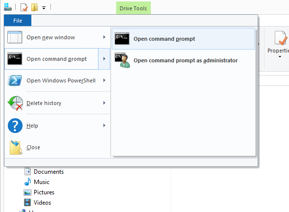 On Windows 8 and 10, access the desktop from the home screen, and run File Explorer (may be in the toolbar). Then select File->Open Command Prompt: