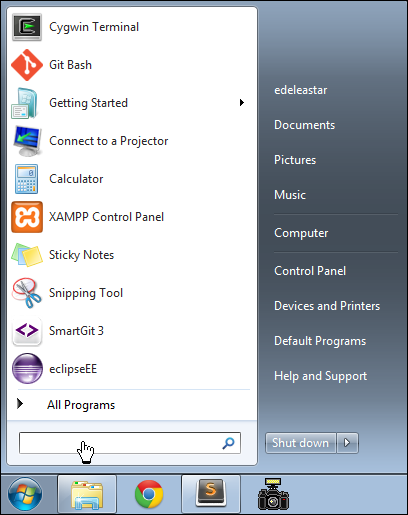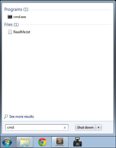 Open a command prompt on Windows. The easiest way to do this is in Windows 7 to type 'cmd' in the Search Box on the Windows start menu: