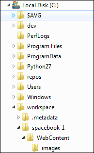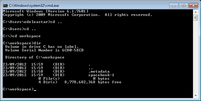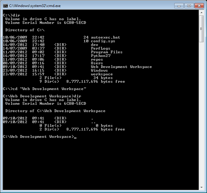 Bear in mind that these commands always have a 'current directory' in mind (a directory is another name for a folder). Try them now and see if you can 'navigate' to your web development workspace. For instance, if the folder is located as shown here: