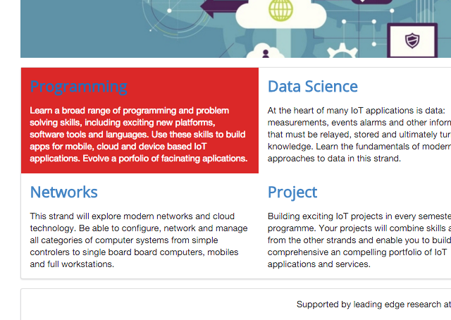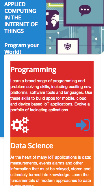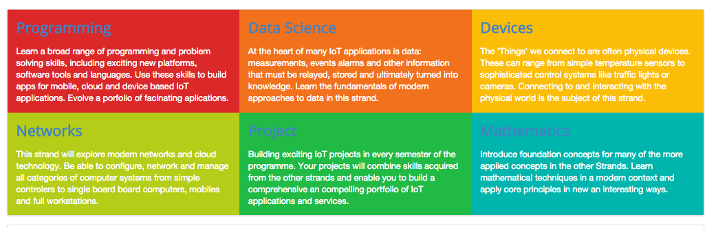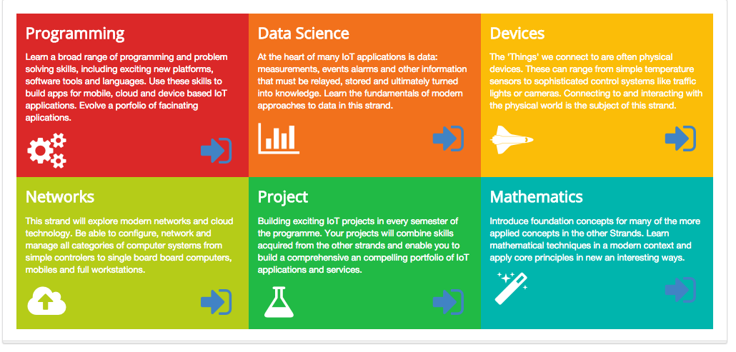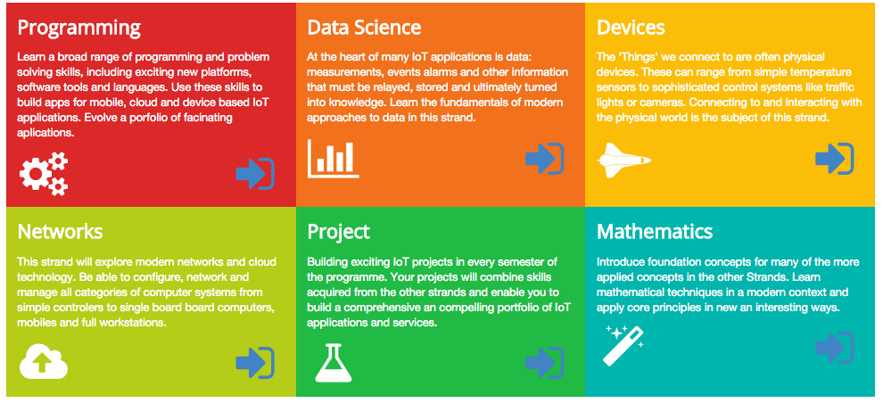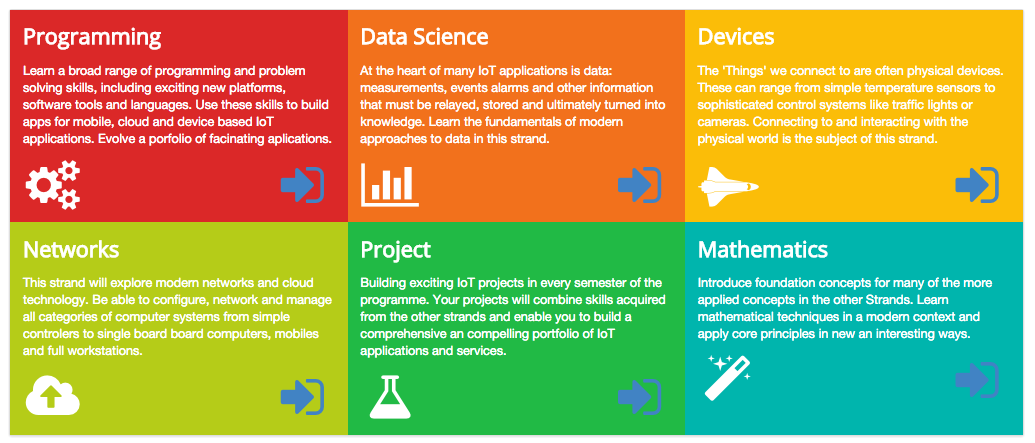Building exciting IoT projects in every semester of the programme. Your projects will combine skills acquired from the other strands and enable you to build a comprehensive an compelling portfolio of IoT applications and services.