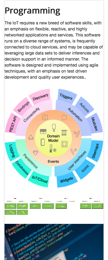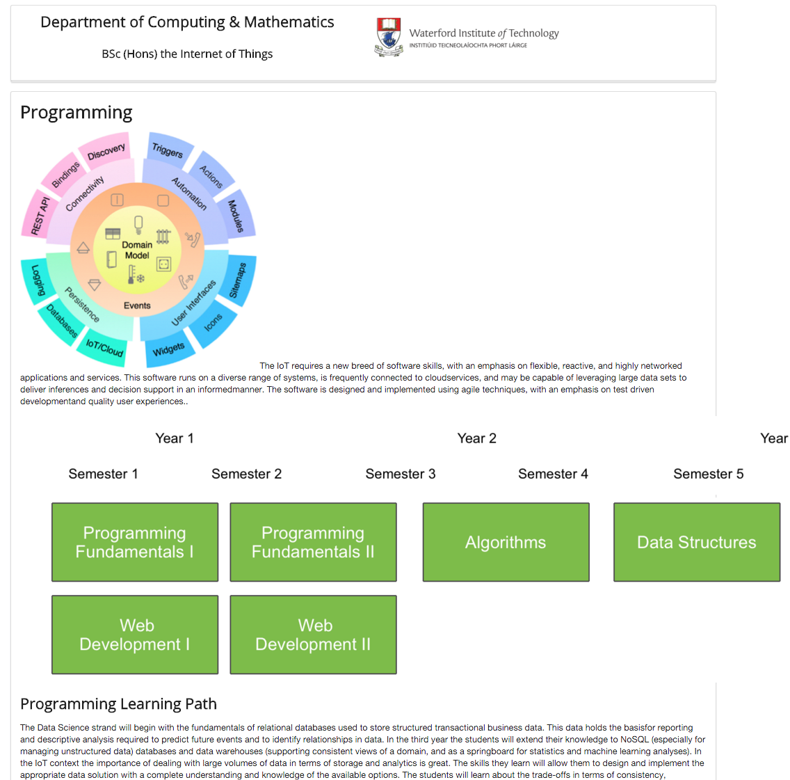 The IoT requires a new breed of software skills, with an emphasis on flexible, reactive, and highly networked applications and services. This software runs on a diverse range of systems, is frequently connected to cloudservices, and may be capable of leveraging large data sets to deliver inferences and decision support in an informedmanner. The software is designed and implemented using agile techniques, with an emphasis on test driven developmentand quality user experiences..